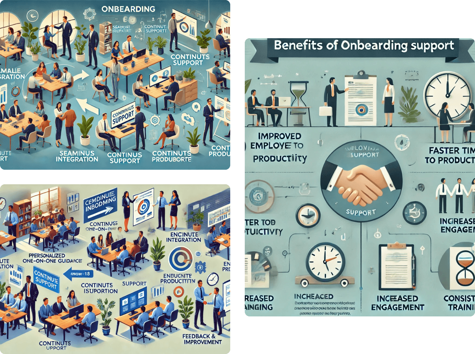 Our onboarding support streamlines the integration process, enhancing employee engagement, reducing time-to-productivity, providing tailored training, and fostering a positive work environment that promotes long-term retention and satisfaction.