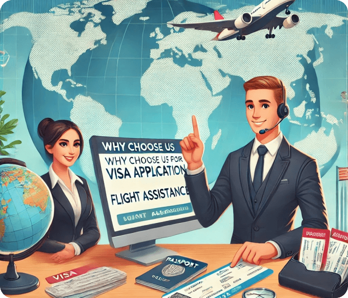 Choose us for expert guidance, personalized service, and efficient processing. Our dedicated team ensures a seamless visa application and flight booking experience, making your travel plans stress-free and successful.